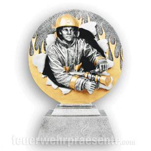 Ein rundes Bild aus Kunstharz, dass einen Feuerwehrmann mit Schlauch abbildet. Auf dem Sockel kann ein individuelles Gravurschild angebracht werden.