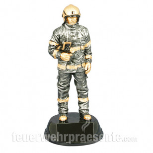 Die Figur trägt schwarze Einsatzkleidung mit in gold angedeuteten Reflexstreifen. Auf dem Rücken ist die Figur mit dem Schriftzug "FIRE" beschriftet.